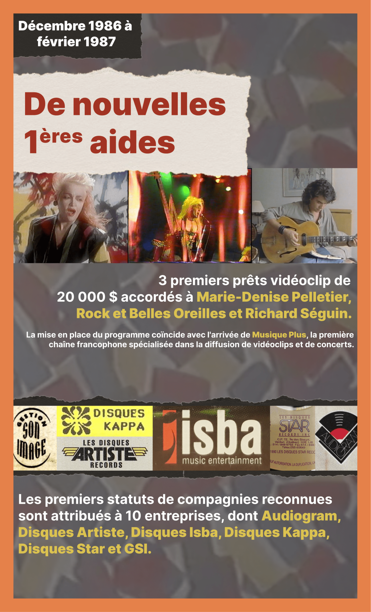 En 1986-1987, les trois premiers prêts vidéoclip sont accordés à Marie-Denise Pelletier, Rock et Belles Oreilles et Richard Séguin. La mise en place du programme coïncide avec l’arrivée de Musique Plus !