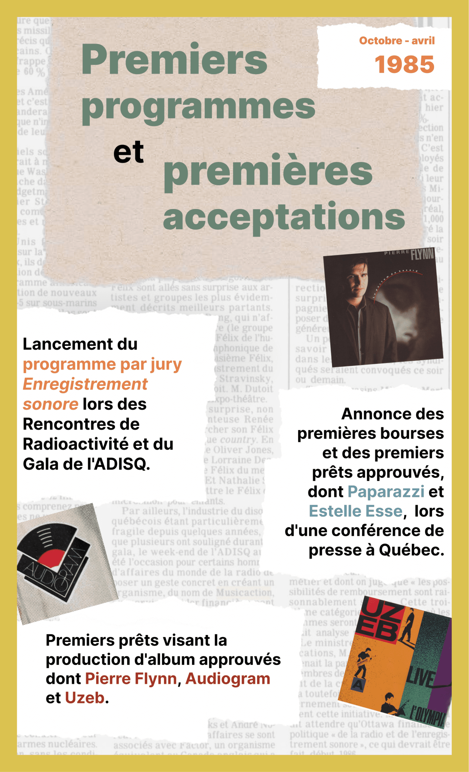 Le programme par jury Enregistrement sonore, composé du Prêt (45 tours, mini-album et album) et de la Bourse à la relève lors des Rencontres de Radioactivité et du Gala de l’ADISQ est lancé 25 octobre 1985.