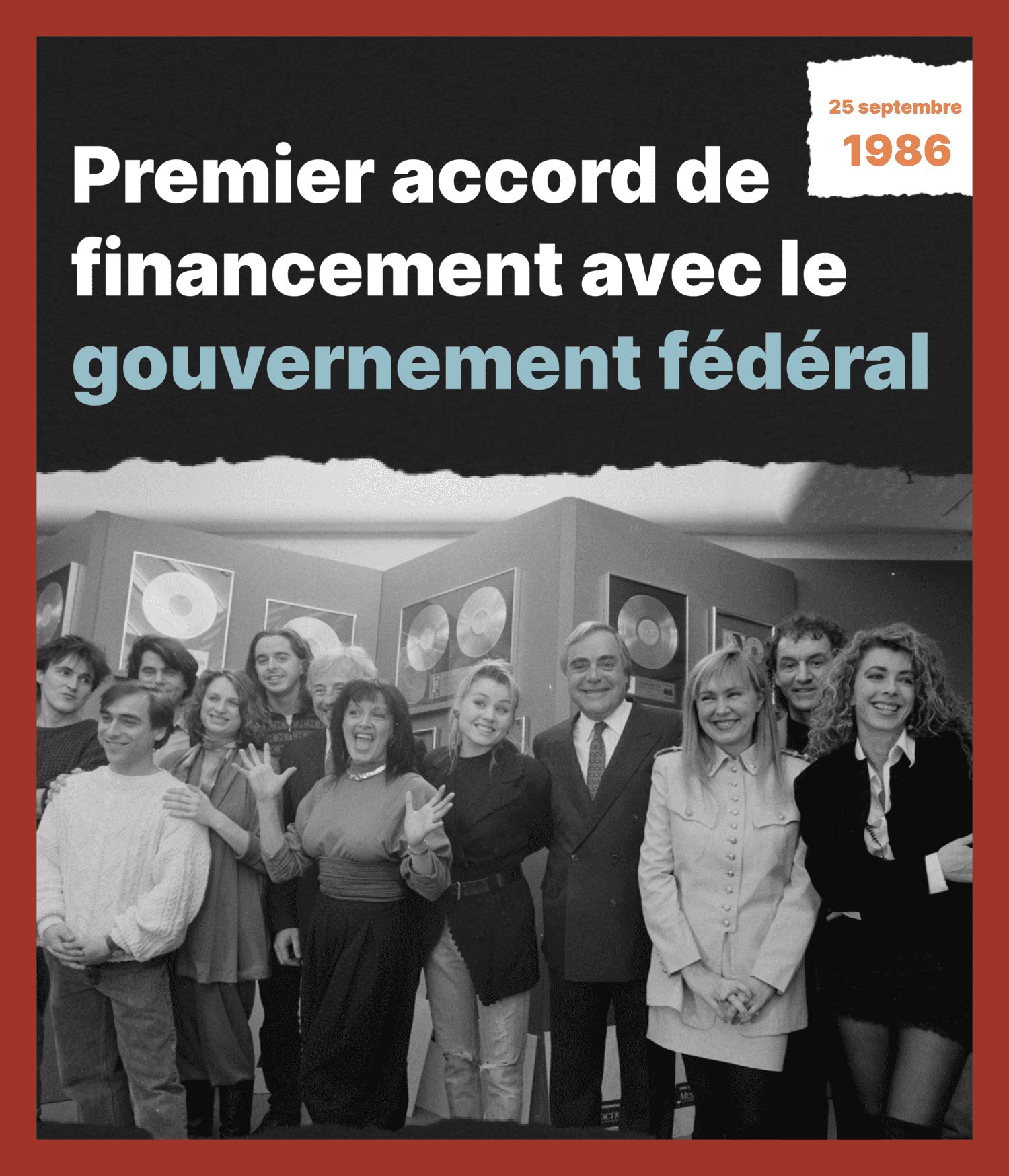 La création – Le 9 septembre 1985, des professionnels de la radio, du disque et du spectacle créent Musicaction pour soutenir le développement de la musique francophone d’ici. Le premier conseil d’administration et l’assemblée générale ont lieu le lendemain, rue Ste-Catherine à Montréal.
