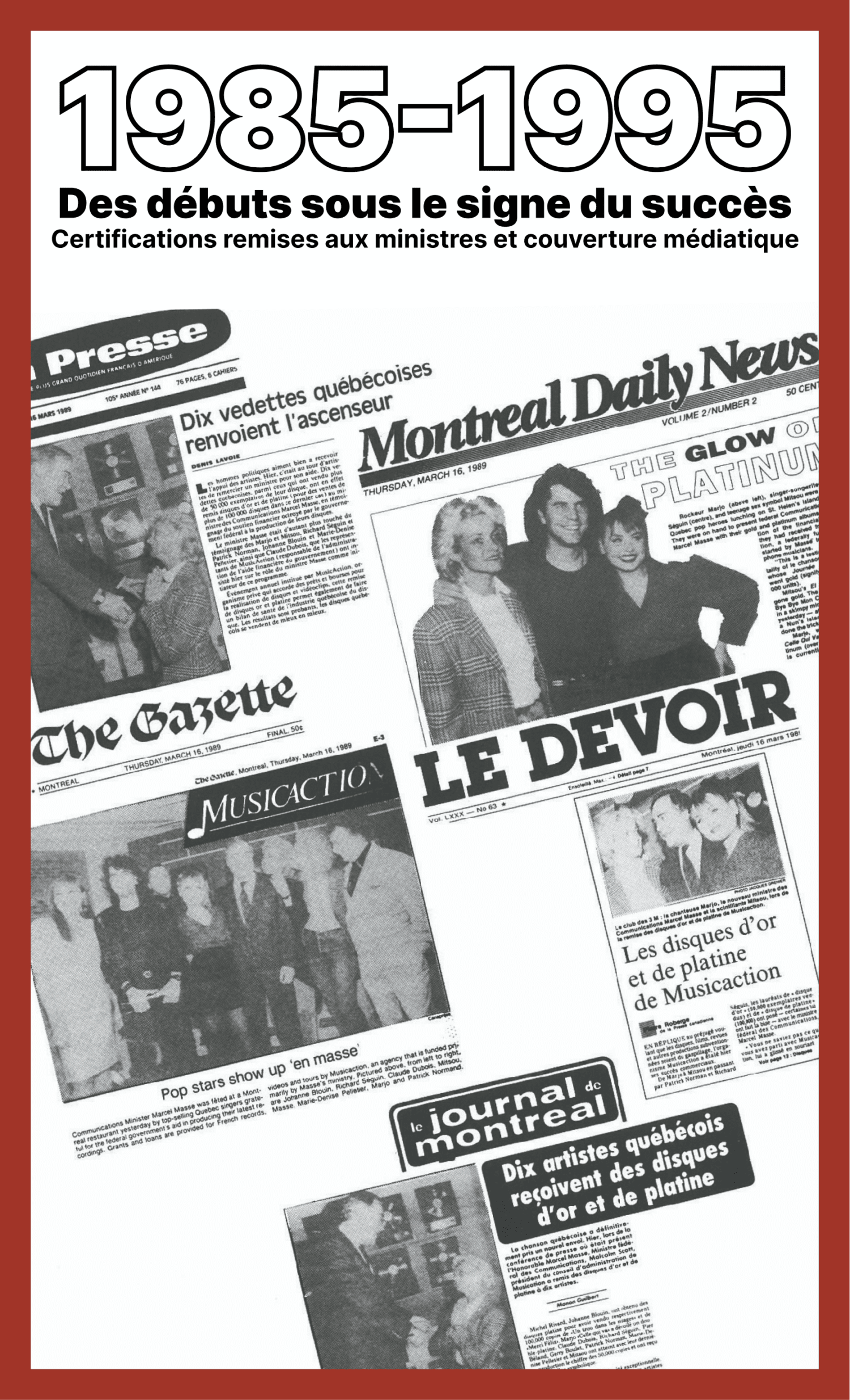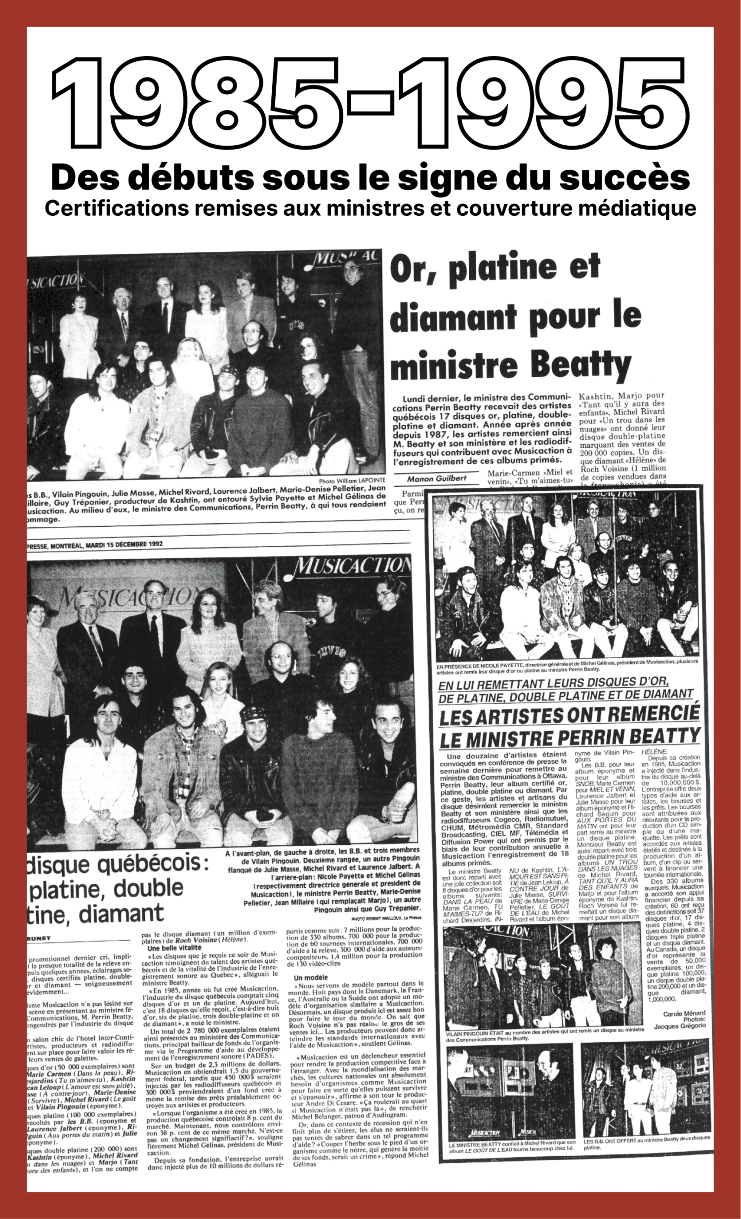De 1985 à 1995, des artistes remettent symboliquement leurs certifications à différents ministres afin de remercier le gouvernement fédéral pour son soutien à la chanson francophone.